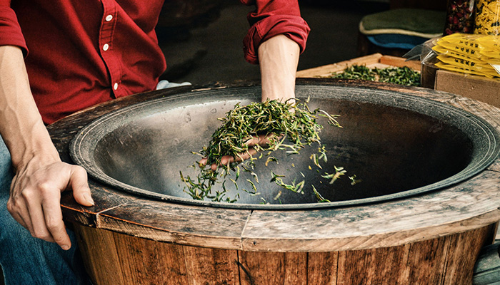 用直径50厘米左右的桶锅,锅温要先高后低,即150—130℃左右。每锅投叶量,特级200—250克,一级以下可增加到500—700克。鲜叶下锅后,闻有炒芝麻声响即为温度适中。单手翻炒,手势要轻,翻炒要快(每分钟50—60次),扬得要高(叶子离开灶面20厘米左右),撒得要开,捞得要净。杀青程度要求适当偏老,即芽叶质地柔软,表面失去光泽,青气消失,茶香显露即可。
