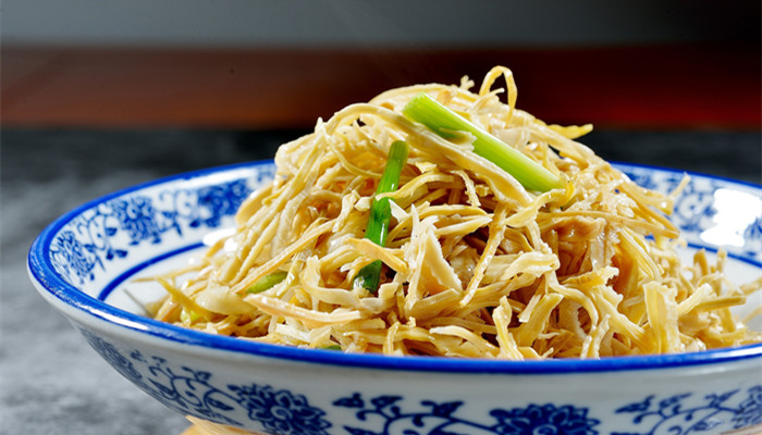 3、把春笋先斜切成片,再切成细丝,放入入开水中焯煮3分钟去除草酸,然后过凉水备用。