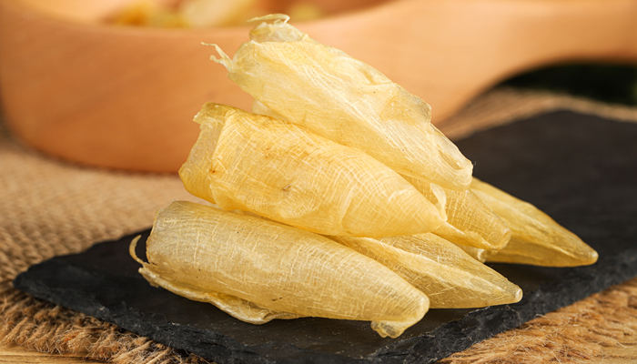 鱼胶是由鱼鳔做成的干制品,其富含丰富的胶质,所以被称为鱼胶。鱼胶又称为鱼鳔、鱼肚、花胶,因食用价值高,素有“海洋人参”之誉,它与燕窝、鱼翅齐名,是“八珍”之一。鱼胶的原料一般来源于石首鱼、黄唇鱼,市面上的鱼胶质量参差不齐,在购买时一定膏药仔细甄别,以免食用假鱼胶,影响身体健康。